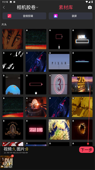 2、進(jìn)入素材庫(kù)的界面內(nèi),選擇好素材后再點(diǎn)擊下一步的按鈕。