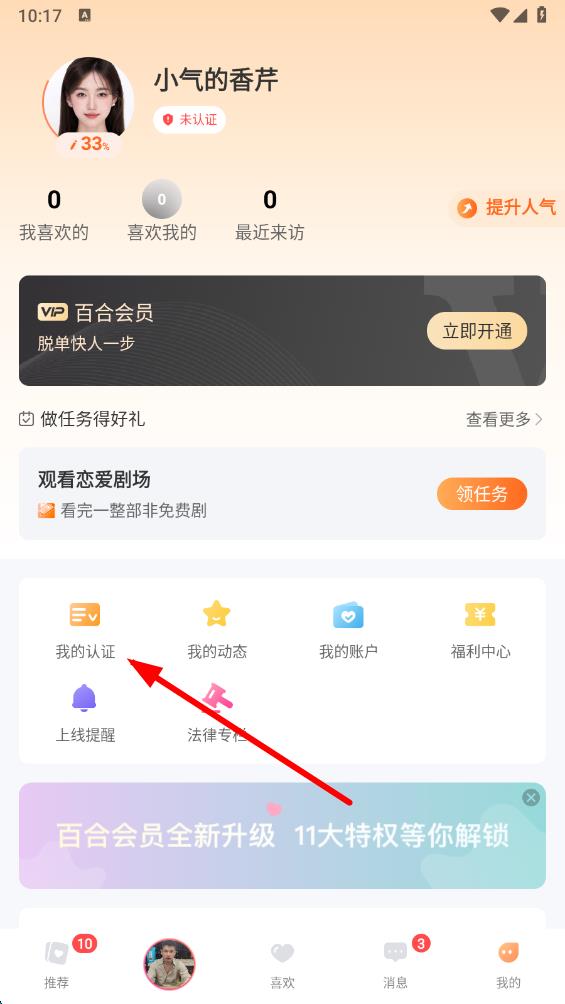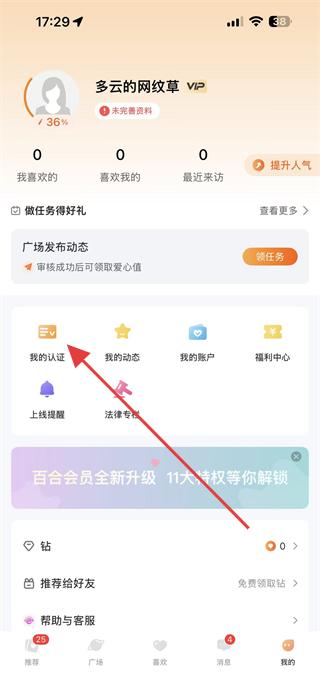 2、在我的頁面里,找到并點擊我的認證的選項。