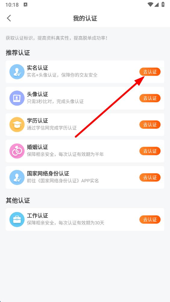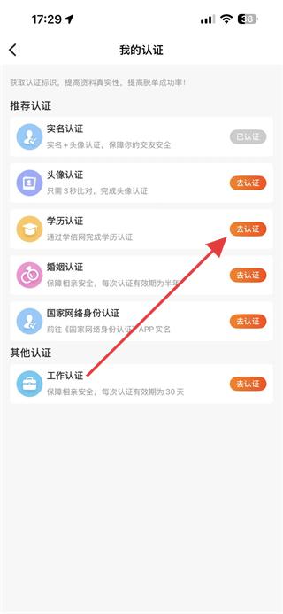 3、在我的認證頁面里,找到學歷認證選項,點擊其右側(cè)的去認證。