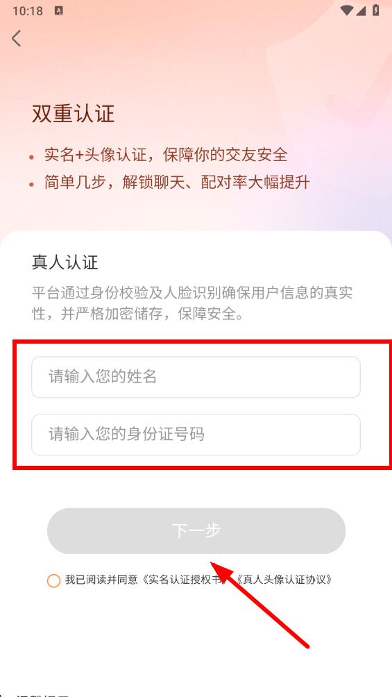 4、在實名認證頁面,輸入您的姓名和身份證號碼,勾選同意相關協(xié)議后,點擊下一步,并按照后續(xù)提示完成實名認證流程。