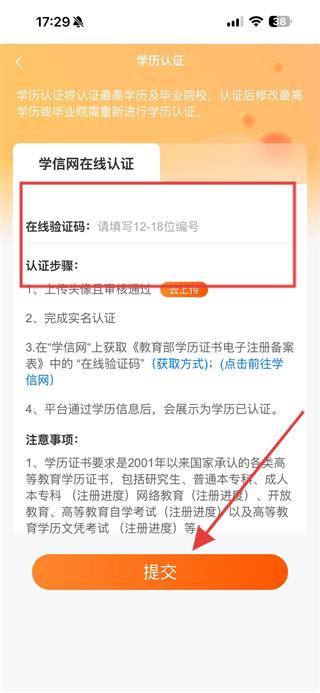 4、進入學歷認證頁面,在在線驗證碼框中填寫12-18位編號,按照認證步驟操作后,點擊提交,等待審核通過即可完成學歷信息認證。