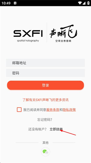 1、打開SXFI聲晰飛應(yīng)用,點擊注冊按鈕,進(jìn)入注冊頁面,輸入郵箱或手機(jī)號。