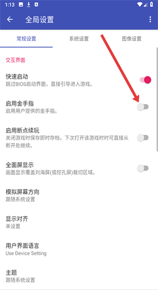 4、在全局設(shè)置頁(yè)面的常規(guī)設(shè)置中,點(diǎn)擊“啟用金手指”右側(cè)的開關(guān),將其開啟。