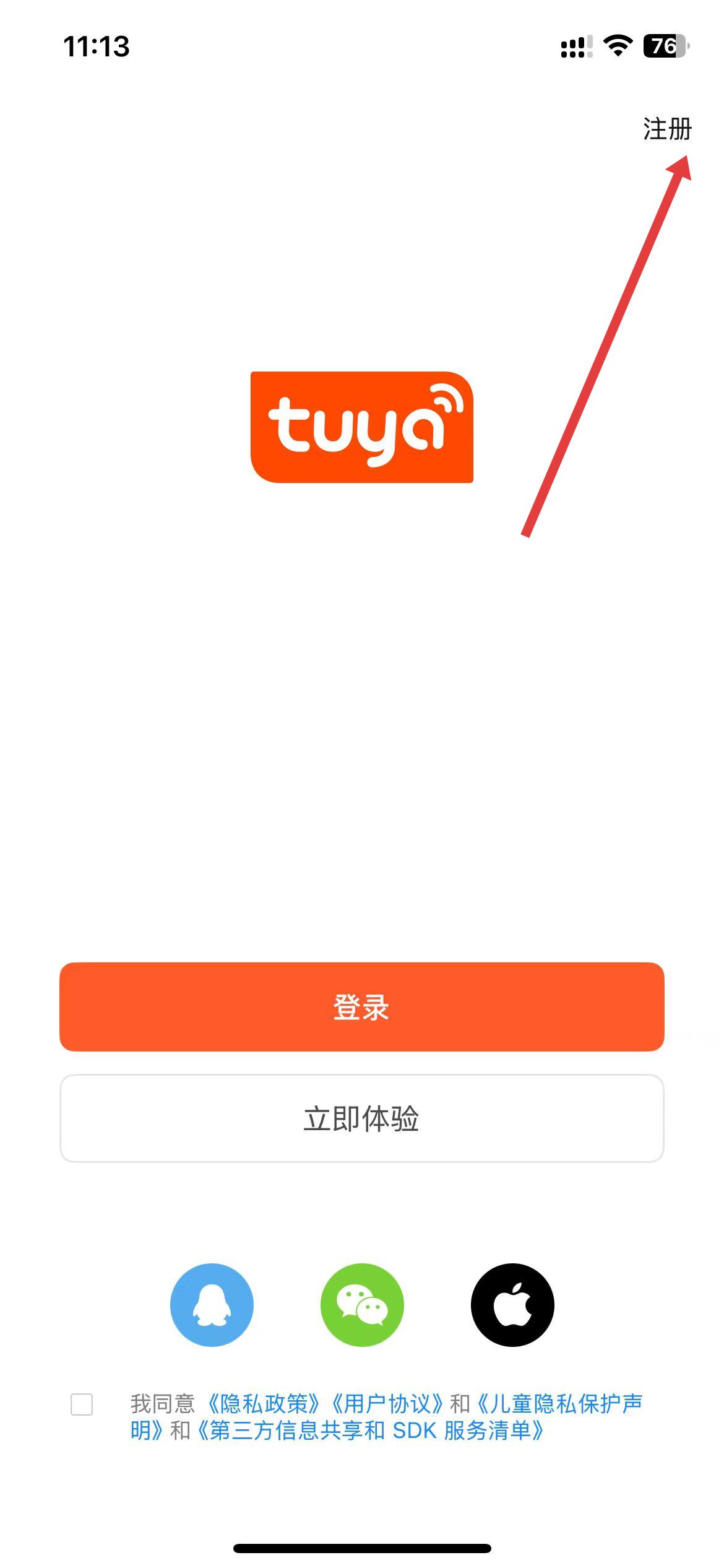 1、打開(kāi)涂鴉智能應(yīng)用,在登錄界面點(diǎn)擊右上角注冊(cè)。