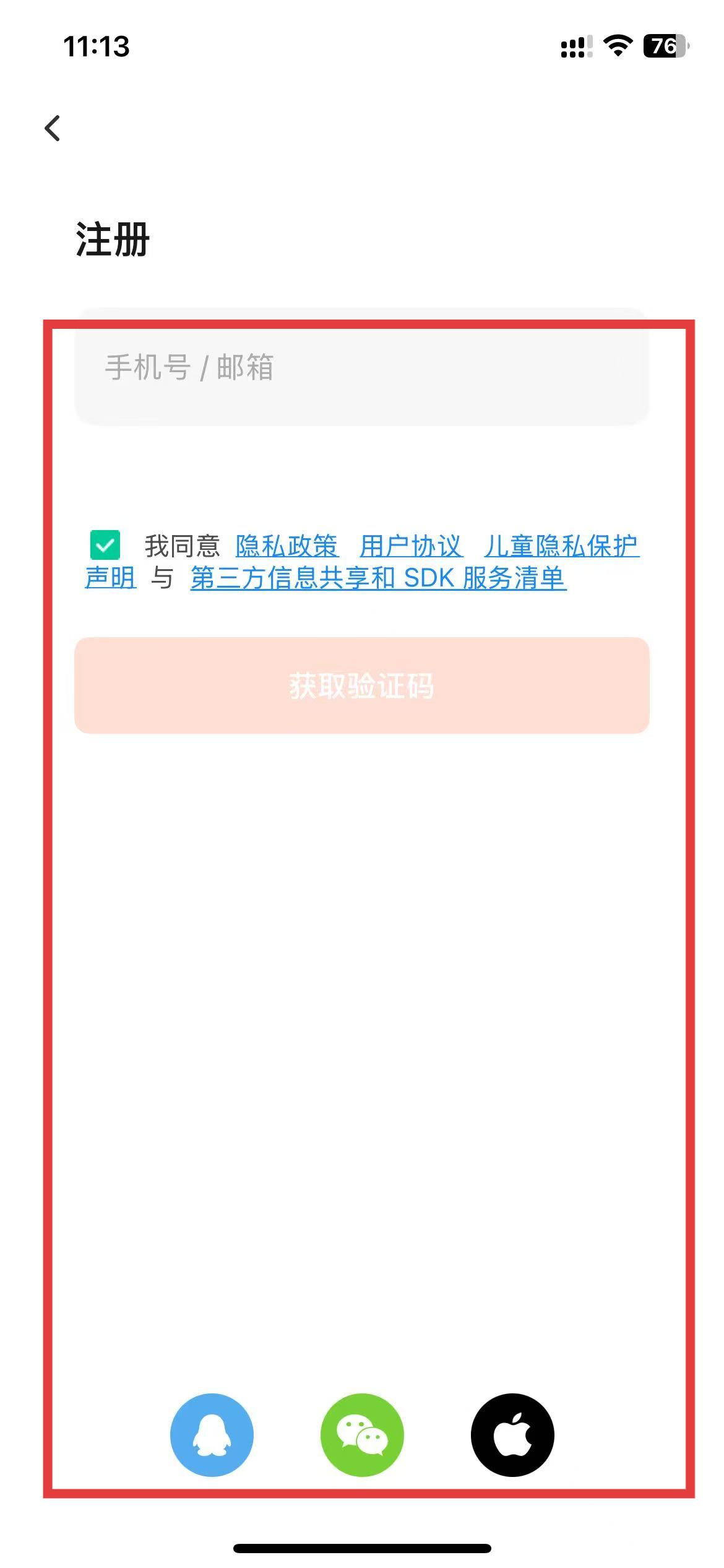 2、在注冊(cè)頁(yè)面輸入手機(jī)號(hào)或郵箱,勾選相關(guān)協(xié)議選項(xiàng)。