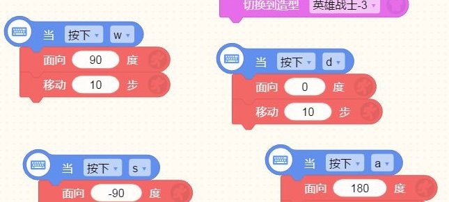 6、設(shè)置按鍵awsd分別控制角色上下左右移動(dòng),需要使用的模塊如圖所示。