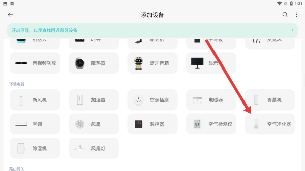 1、在添加設(shè)備頁(yè)面中,下滑屏幕找到空氣凈化器圖標(biāo),點(diǎn)擊開(kāi)始添加該設(shè)備。