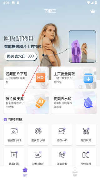 1、打開下載王APP,在主界面找到并點(diǎn)擊照片橡皮擦功能選項(xiàng),進(jìn)入圖片橡皮擦操作頁(yè)面。