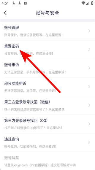 4、進(jìn)入賬號(hào)與安全頁面后,點(diǎn)擊重置密碼選項(xiàng),按照提示完成密碼修改操作。