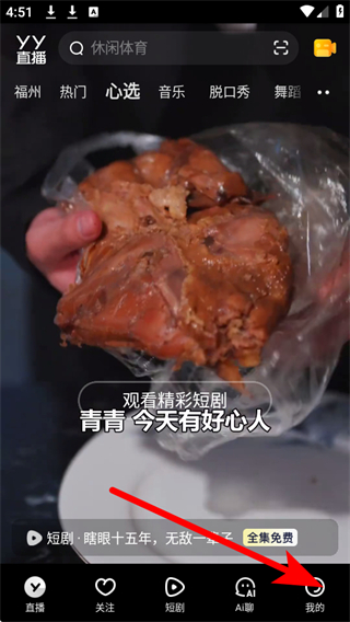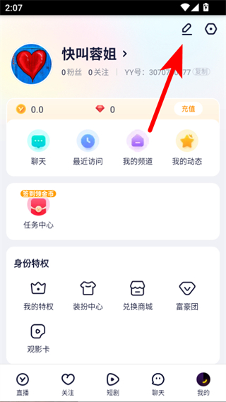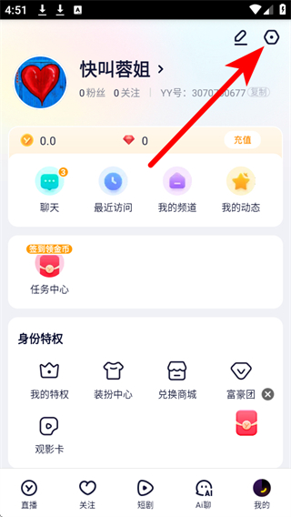1、打開YY App,點(diǎn)擊底部導(dǎo)航欄的我的選項(xiàng),進(jìn)入個(gè)人頁面。