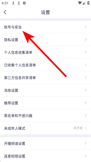 3、在設(shè)置頁面中,點(diǎn)擊賬號(hào)與安全選項(xiàng)。
