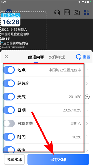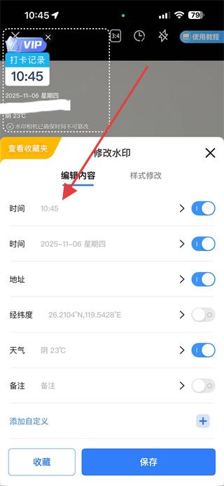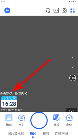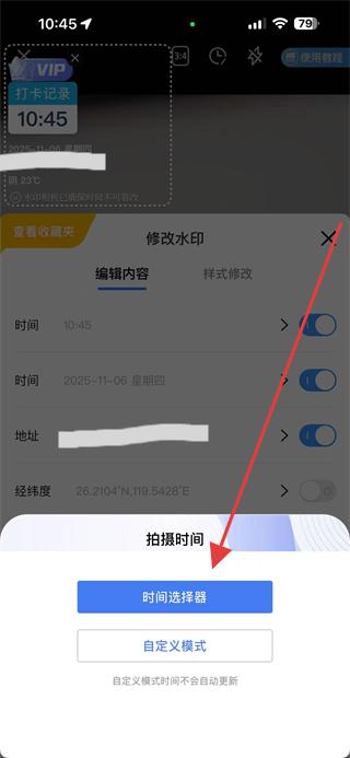 2、進(jìn)入拍攝頁面后,點(diǎn)擊打卡記錄水印區(qū)域,可修改地點(diǎn)、經(jīng)緯度、天氣、日期、時(shí)間等內(nèi)容。