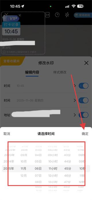 4、在時(shí)間選擇頁面選擇想要修改的時(shí)間,點(diǎn)擊確定,即可完成萬能水印相機(jī)打卡APP的時(shí)間修改。