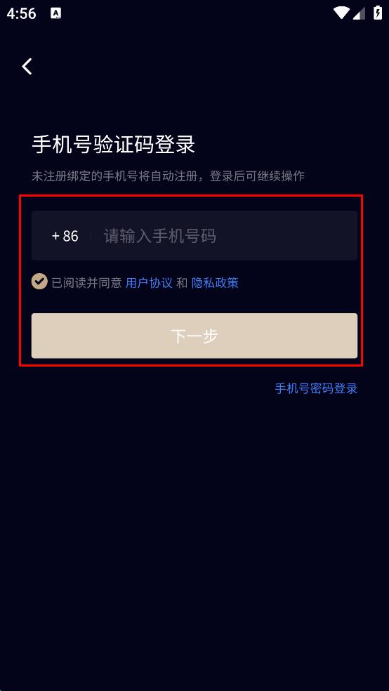 3、在手機(jī)號驗(yàn)證碼登錄頁面,輸入手機(jī)號碼,點(diǎn)擊下一步按鈕。