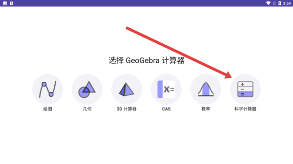 1、在GeoGebra計(jì)算器選擇界面,點(diǎn)擊科學(xué)計(jì)算器圖標(biāo),進(jìn)入計(jì)算界面,開啟數(shù)學(xué)運(yùn)算操作流程,為后續(xù)計(jì)算做準(zhǔn)備。