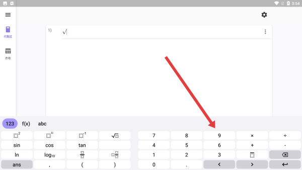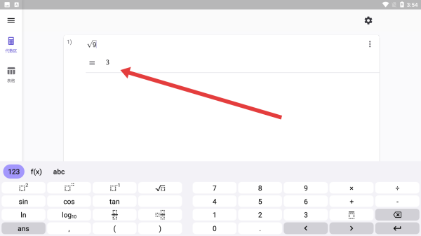 3、在科學(xué)計(jì)算器輸入運(yùn)算公式后,系統(tǒng)自動在公式下方顯示結(jié)果,如√9運(yùn)算后界面呈現(xiàn)=3,快速獲取計(jì)算答案。
