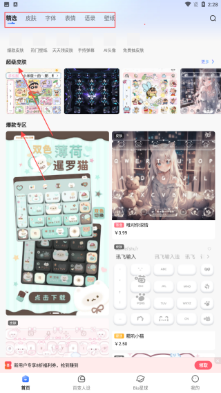1、打開訊飛輸入法進(jìn)入相關(guān)界面,點(diǎn)擊頂部皮膚選項(xiàng),可在超級皮膚和爆款專區(qū)等板塊瀏覽各種風(fēng)格的鍵盤皮膚,像卡通、炫酷等風(fēng)格,找到喜歡的皮膚后點(diǎn)擊下載。