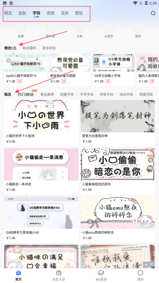 2、點(diǎn)擊頂部字體選項(xiàng),能看到精選1元,甄選等分類,里面有可愛圓、手寫字體等多種字體,部分字體可能需要支付購買,選擇心儀字體后按提示操作。