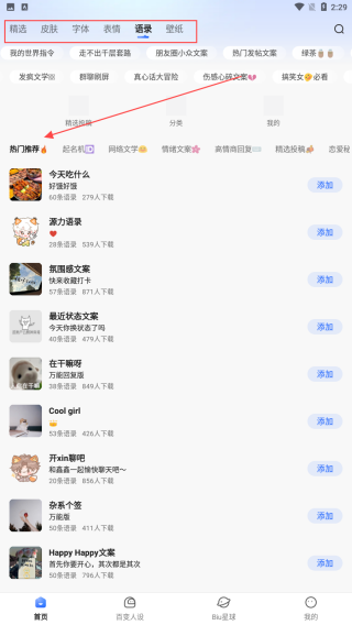 3、點(diǎn)擊頂部語錄選項(xiàng),在熱門推薦等分類下,有各種類型的文案語錄,比如美食相關(guān)的今天吃什么、氛圍感文案等,點(diǎn)擊添加將感興趣的語錄添加到輸入法。
