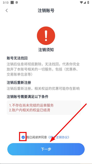 4、在注銷賬號頁面勾選同意相關(guān)協(xié)議后點擊下一步按鈕,按提示完成賬號注銷操作。