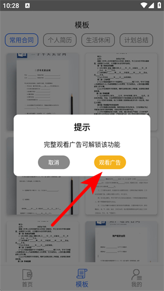 3、若彈出提示框,點擊觀看廣告,看完廣告后解鎖模板功能。