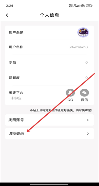 2、個人信息頁面點擊“切換登錄”,進入登錄方式選擇頁面。