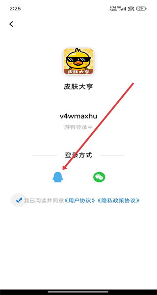 3、在登錄方式選擇頁面選擇QQ登錄,進入QQ頭像和昵稱信息授權(quán)頁面。
