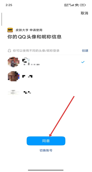 4、在QQ頭像和昵稱信息授權(quán)頁面點擊“同意”,完成賬號切換登錄操作。