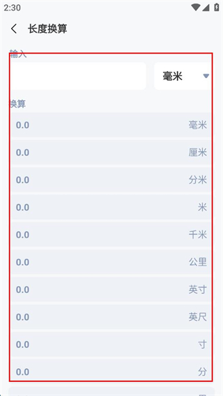 4、進(jìn)入長度換算頁面,輸入數(shù)值并選擇單位,即可查看多種長度單位的換算結(jié)果。
