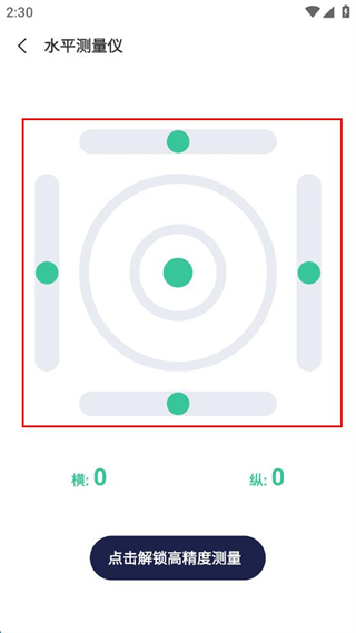 2、在水平測量儀頁面,查看橫縱數(shù)值,點(diǎn)擊“點(diǎn)擊解鎖高精度測量”按鈕可開啟高精度測量。