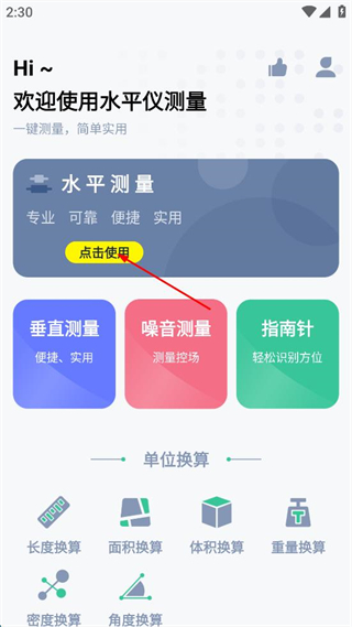 1、點(diǎn)擊“水平測量”板塊黃色“點(diǎn)擊使用”按鈕,進(jìn)入水平測量儀頁面。
