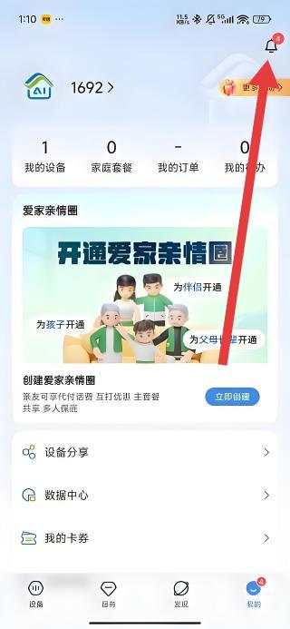 1、進(jìn)入應(yīng)用我的頁面,點(diǎn)擊右上角消息鈴鐺圖標(biāo),進(jìn)入查看設(shè)備與系統(tǒng)信息列表界面。