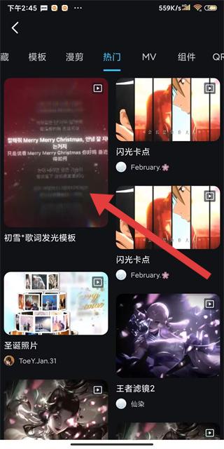 2.在模板界面,切換到熱門標(biāo)簽,挑選喜歡的3D魔秀模板,如初雪·歌詞發(fā)光模板并點擊。