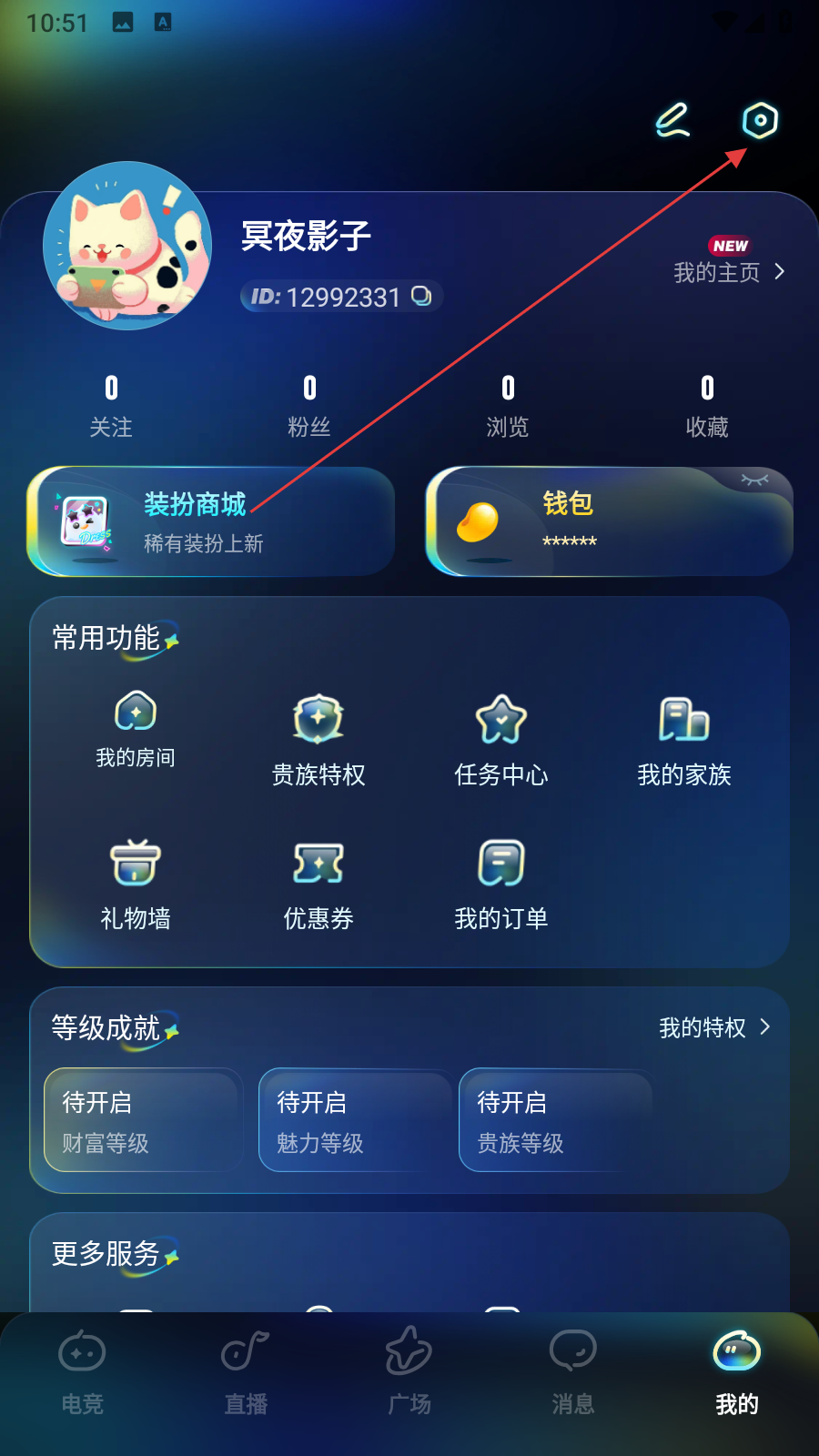 1、打開(kāi)不鴿電競(jìng)APP,進(jìn)入我的頁(yè)面,點(diǎn)擊右上角的設(shè)置圖標(biāo),進(jìn)入設(shè)置界面。