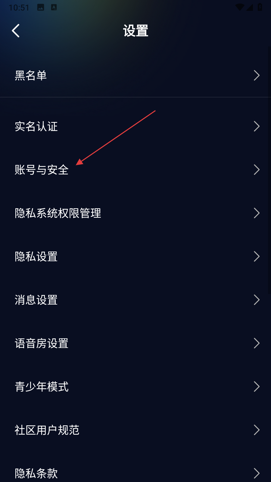 2、在設(shè)置界面中,找到賬號(hào)與安全選項(xiàng)并點(diǎn)擊,進(jìn)入賬號(hào)與安全頁(yè)面。
