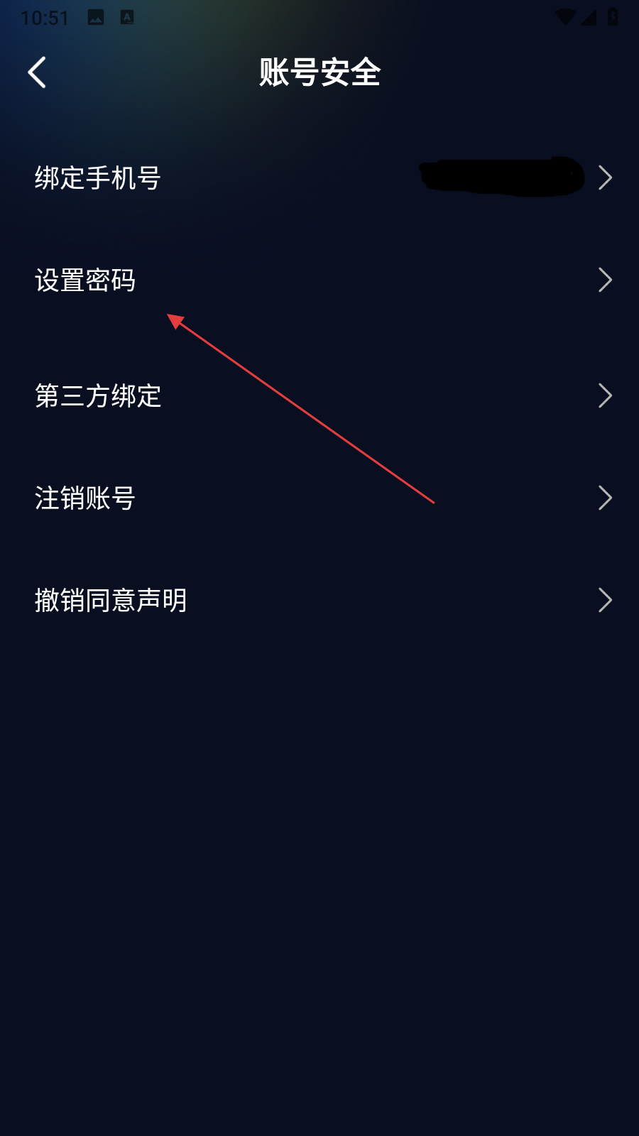 3、在賬號(hào)與安全頁(yè)面里,點(diǎn)擊設(shè)置密碼選項(xiàng),進(jìn)入設(shè)置密碼頁(yè)面。