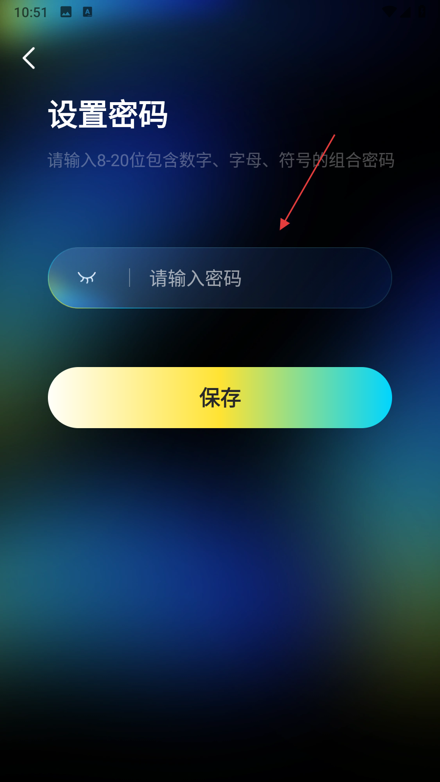 4、在設(shè)置密碼頁(yè)面中,輸入8-20位包含數(shù)字、字母、符號(hào)的組合密碼,輸入完成后點(diǎn)擊保存。