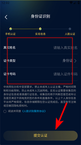 4、在身份證識(shí)別頁(yè)面,輸入真實(shí)姓名、選擇證件類型并輸入證件號(hào)碼,勾選同意協(xié)議后點(diǎn)擊提交認(rèn)證按鈕,即可完成實(shí)名認(rèn)證操作。