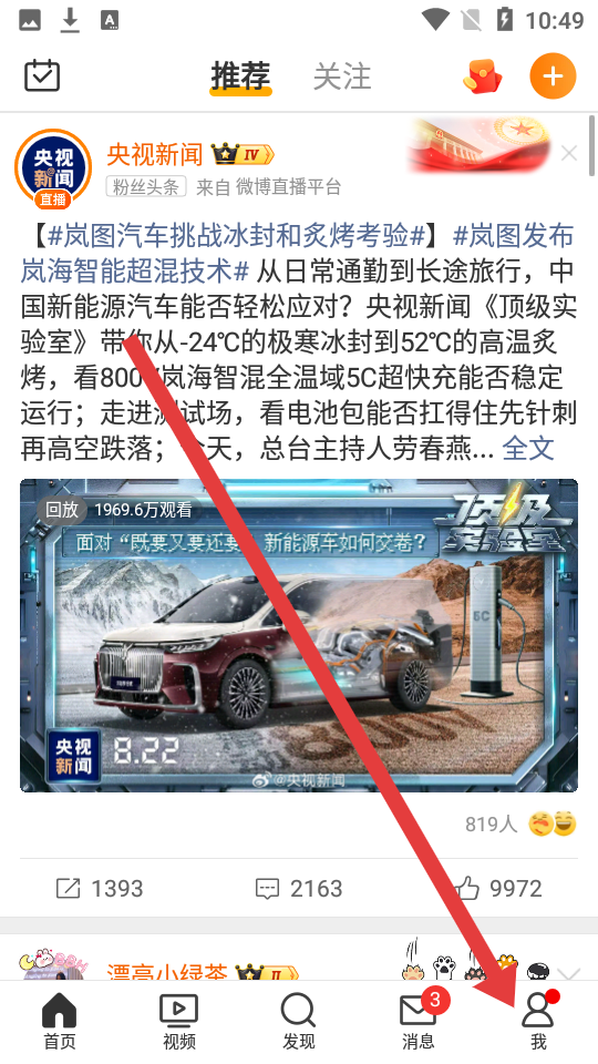1、打開微博APP,找到并點(diǎn)擊底部導(dǎo)航欄右下角的的我,進(jìn)入個(gè)人頁(yè)面。