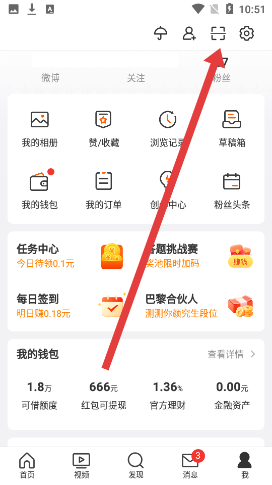 2、在個(gè)人頁(yè)面中,點(diǎn)擊右上角設(shè)置圖標(biāo)旁邊的掃碼圖標(biāo),進(jìn)入掃碼頁(yè)面。