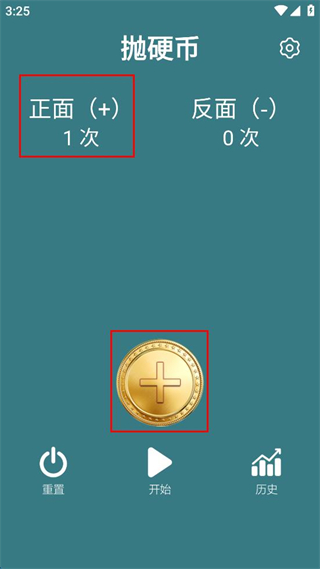 4、可多次點擊“開始”進行拋擲,頁面會統(tǒng)計正面和反面的次數(shù)。