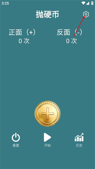 1、打開拋硬幣軟件,點擊右上角設置圖標,選擇擲硬幣動作向上拋或原地轉。