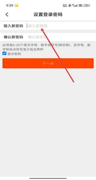 4、在完成驗證后跳轉(zhuǎn)到設置登錄密碼頁面中,點擊輸入框即可輸入新密碼進行修改。