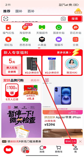 1、進入天貓首頁后,可以點擊下方我,跳轉(zhuǎn)頁面進入我的主頁。
