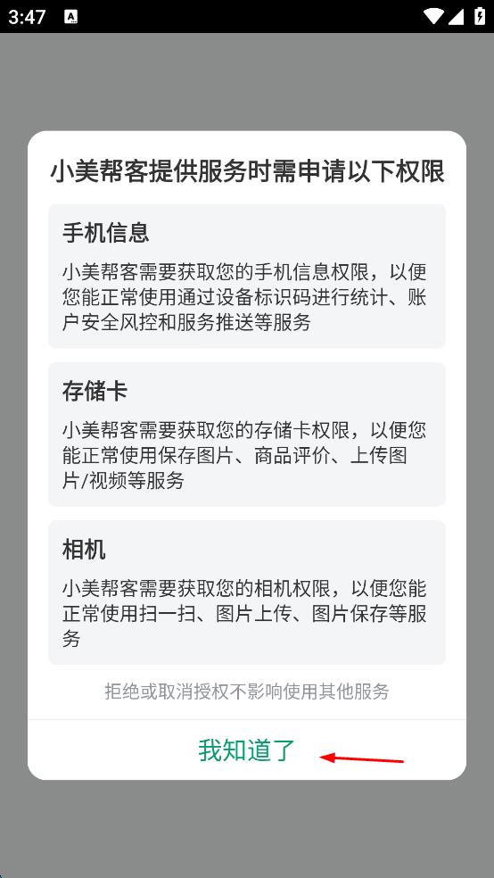 1、打開小美幫客App,出現(xiàn)權(quán)限申請(qǐng)彈窗,閱讀后點(diǎn)擊我知道了按鈕。
