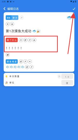 4、在編輯日志內(nèi),輸入今日摸魚的感想,輸入后再點擊右上角打鉤的圖標(biāo)。