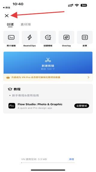1、打開VN視頻剪輯APP,進入到剪輯的頁面內(nèi),點擊×的按鈕回到主頁內(nèi)。