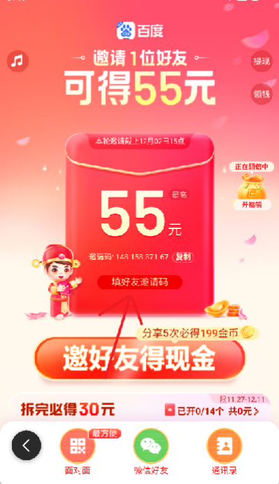 3、點擊后進(jìn)入邀請好友活動界面,在中間的紅包位置有一個【填寫好友邀請碼】的選項,點擊一下即可填寫好友的邀請碼。