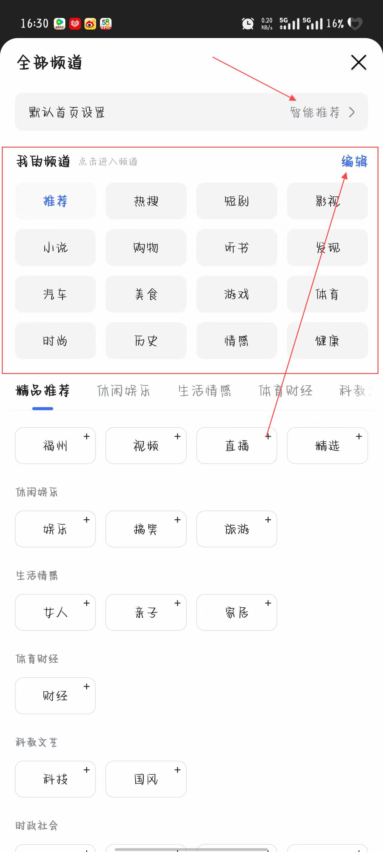 2、在全部頻道頁面,能看到我的頻道區(qū)域,點擊該區(qū)域右上角的編輯按鈕,即可對已添加到頻道欄的內(nèi)容進(jìn)行排序、刪除等操作。