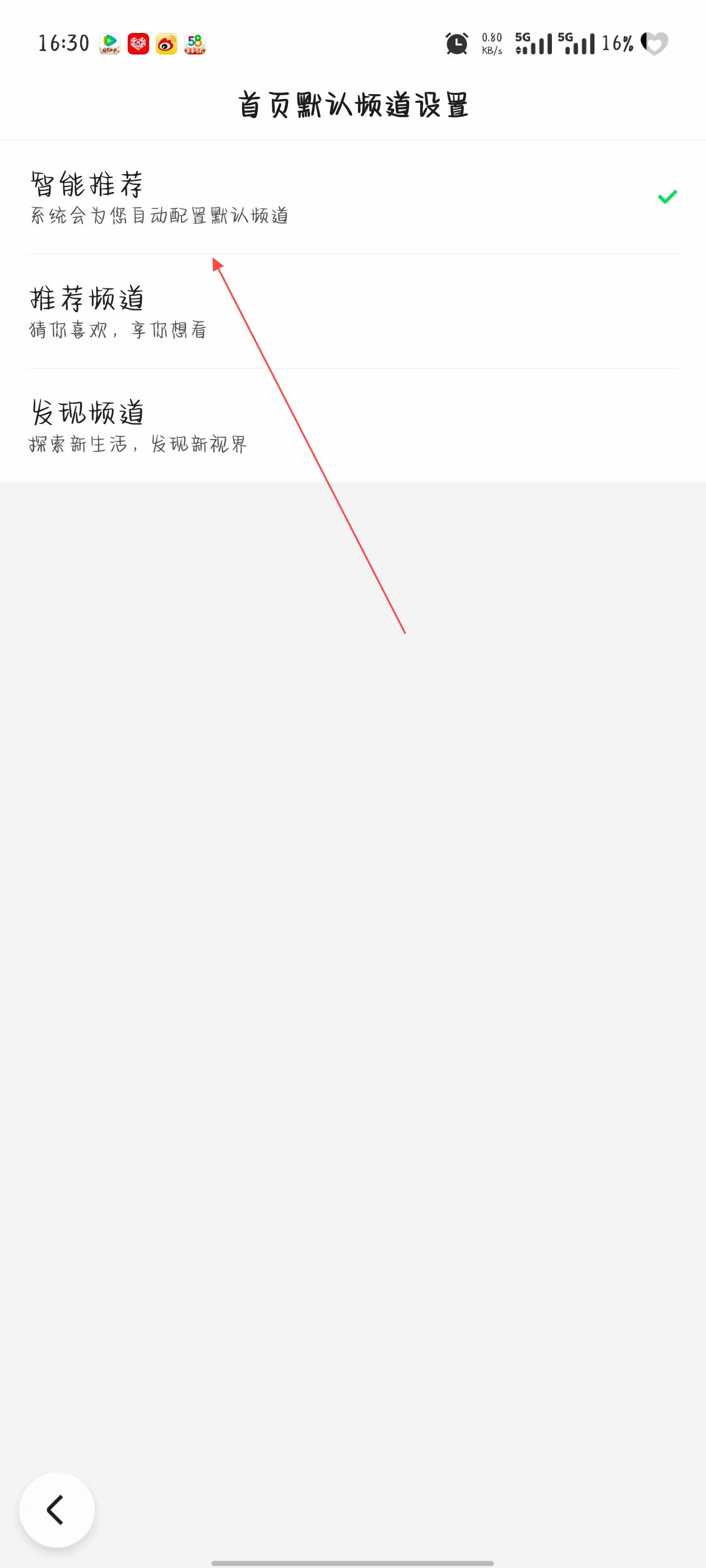 3、如果想要設(shè)置首頁默認(rèn)顯示的頻道類型,點擊全部頻道頁面“默認(rèn)首頁設(shè)置右側(cè)的智能推薦,在彈出的首頁默認(rèn)頻道設(shè)置頁面中,選擇智能推薦,推薦頻道或者發(fā)現(xiàn)頻道等選項。